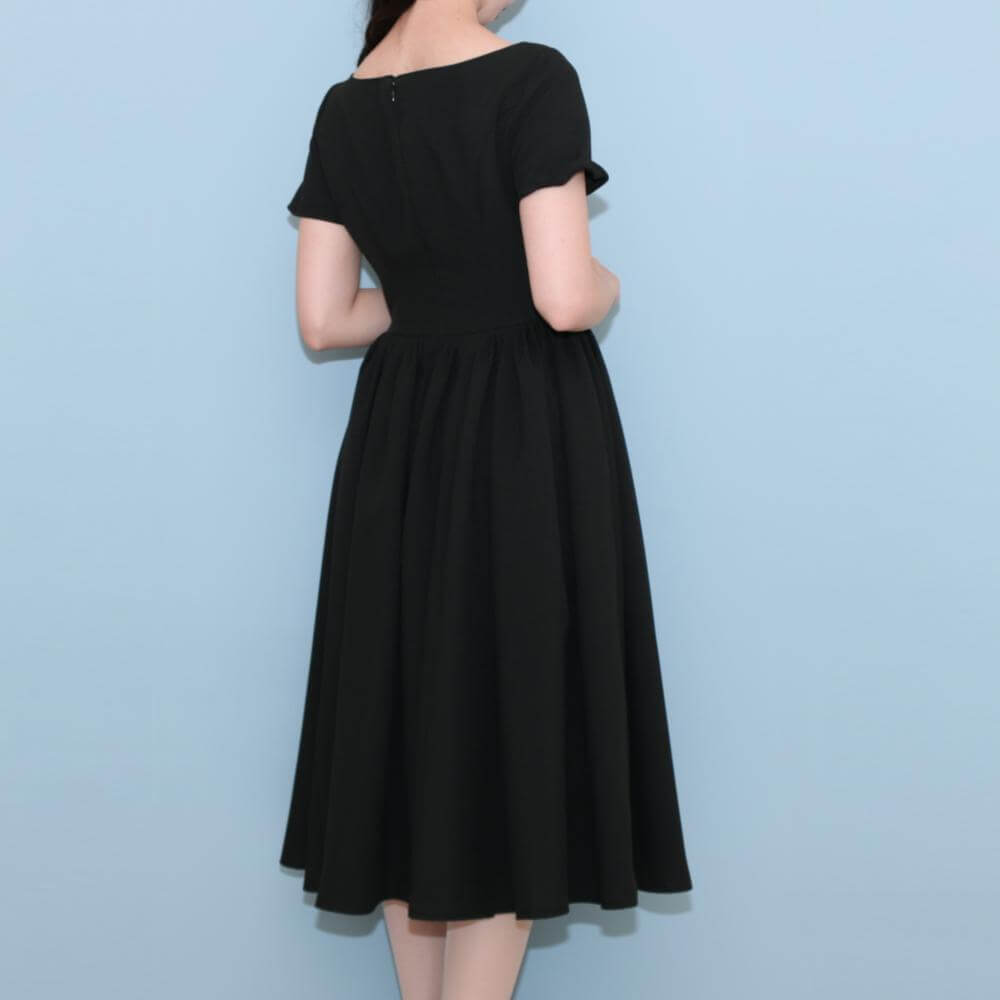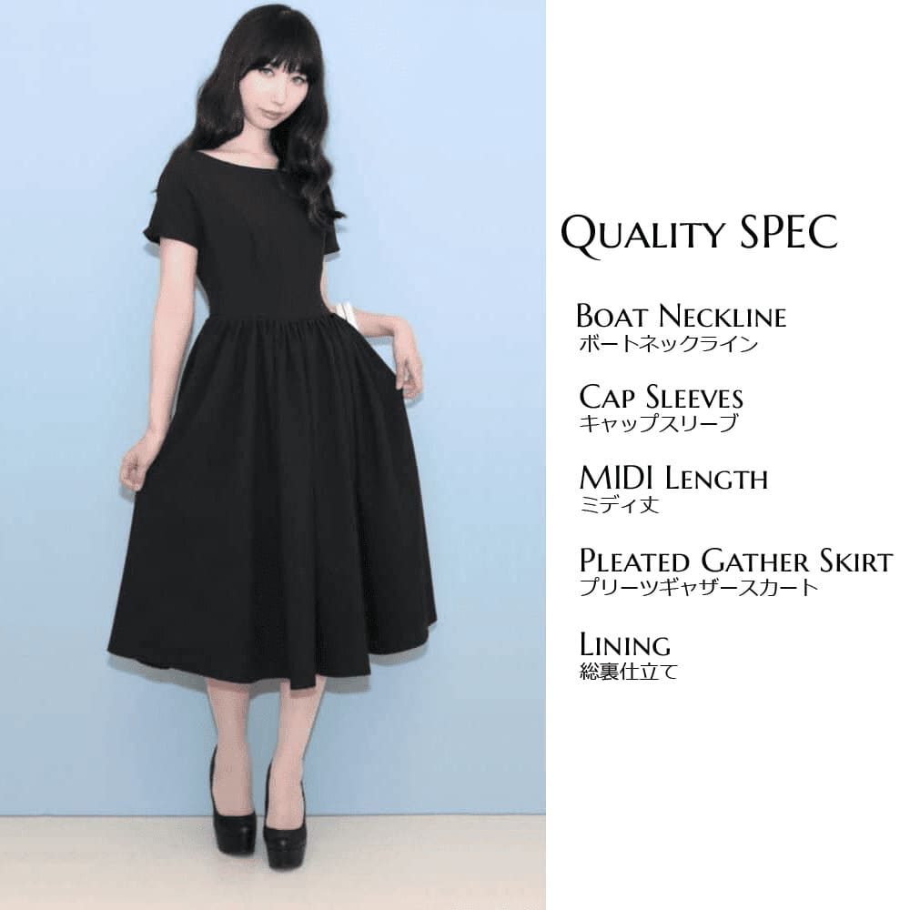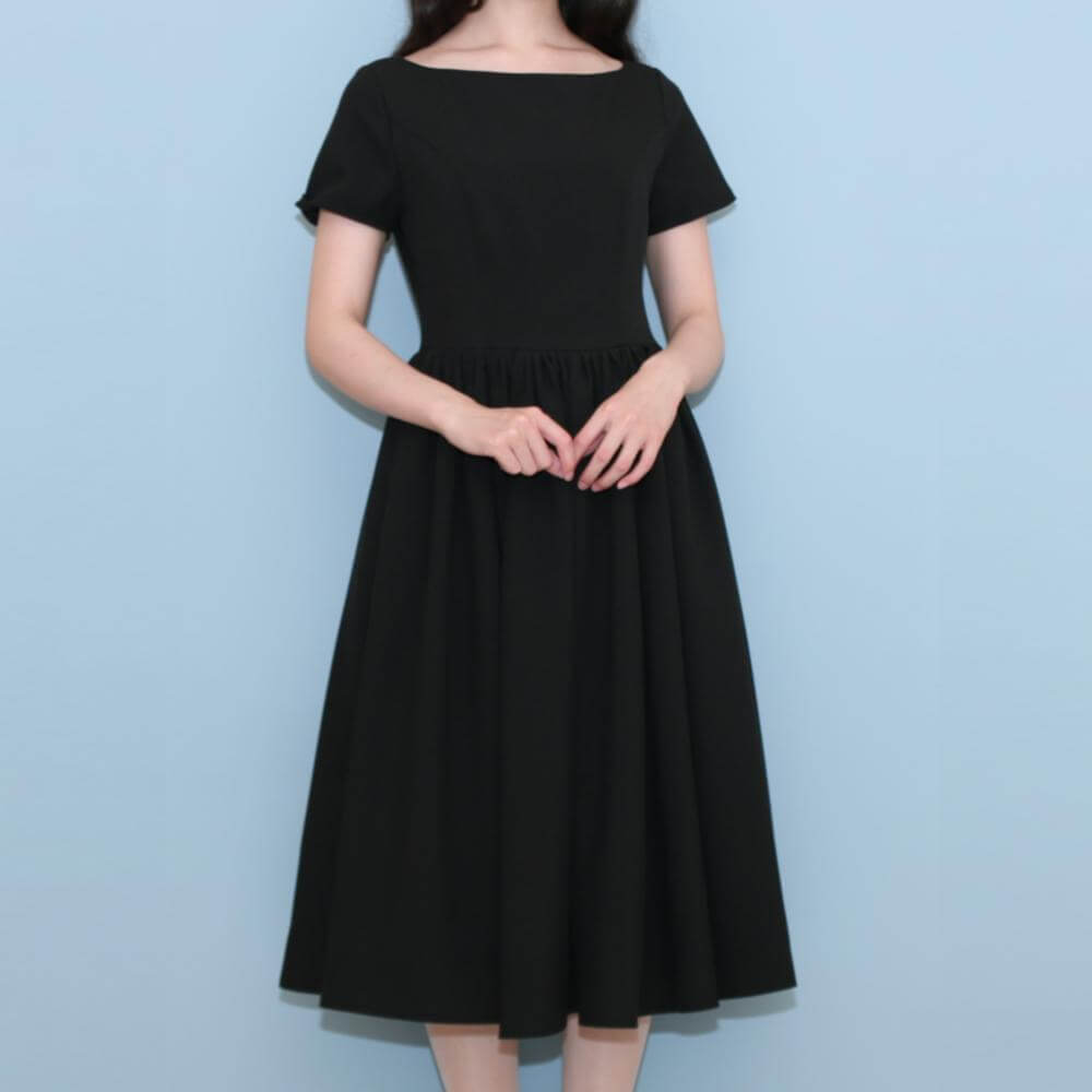 プリーツギャザースカートにミディ(ミモレ)丈のブラックドレスです。