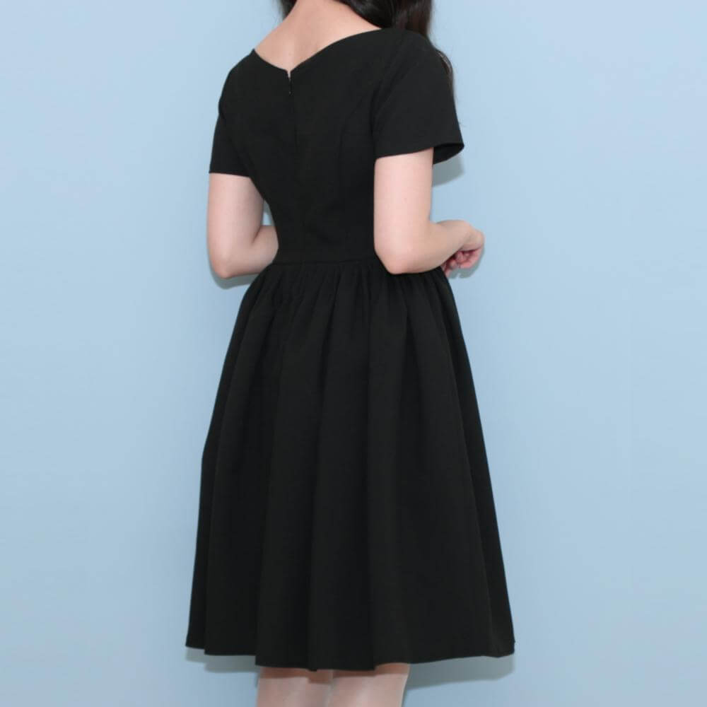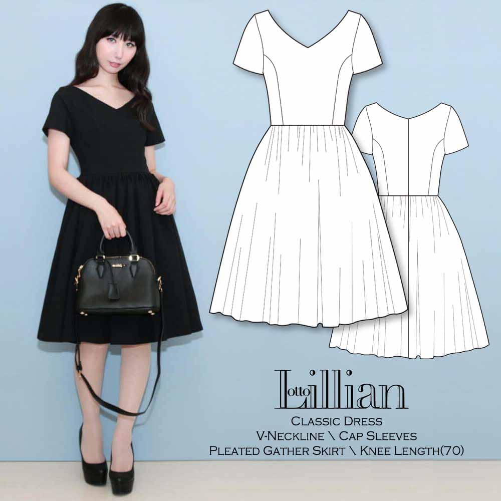 身頃はタイトでウエストがくびれており、スカートは裾に向かって広がるボリュームのある女性らしいフィットアンドフレアシルエットのデザイン
