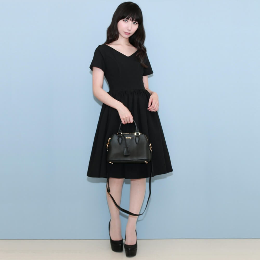プリーツギャザースカートに膝下丈のブラックドレスです。