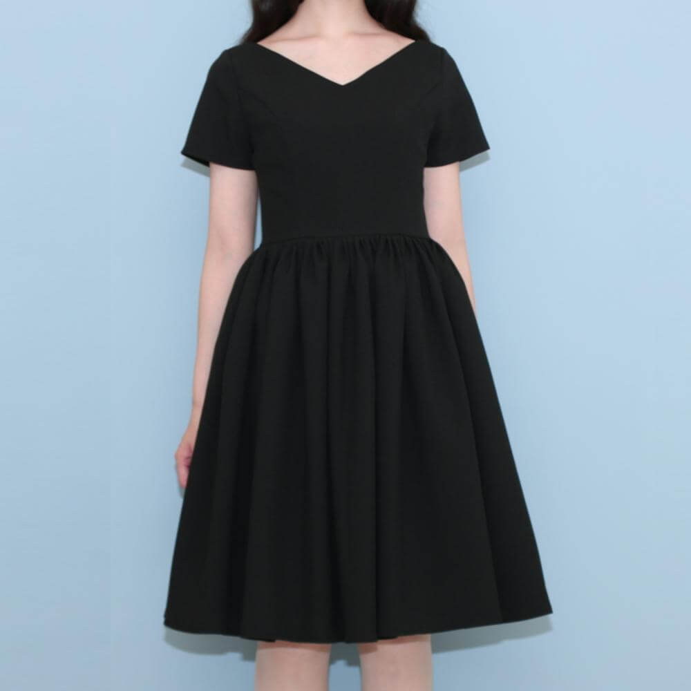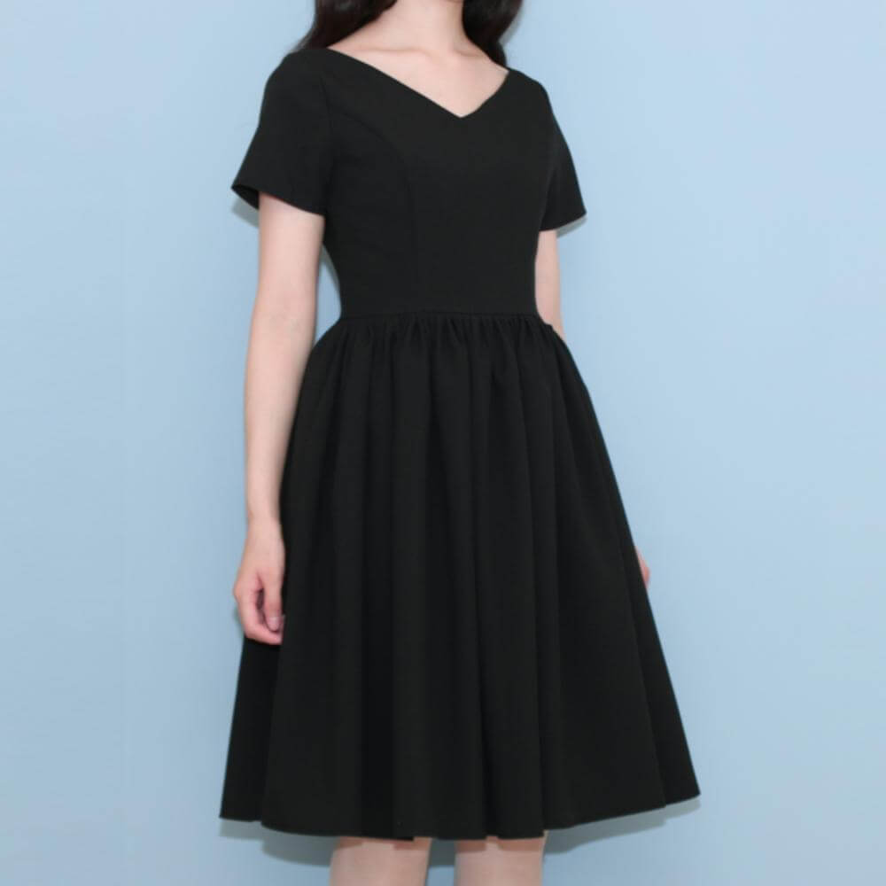 クラシックな浅めのVネックラインのワンピースドレスです。