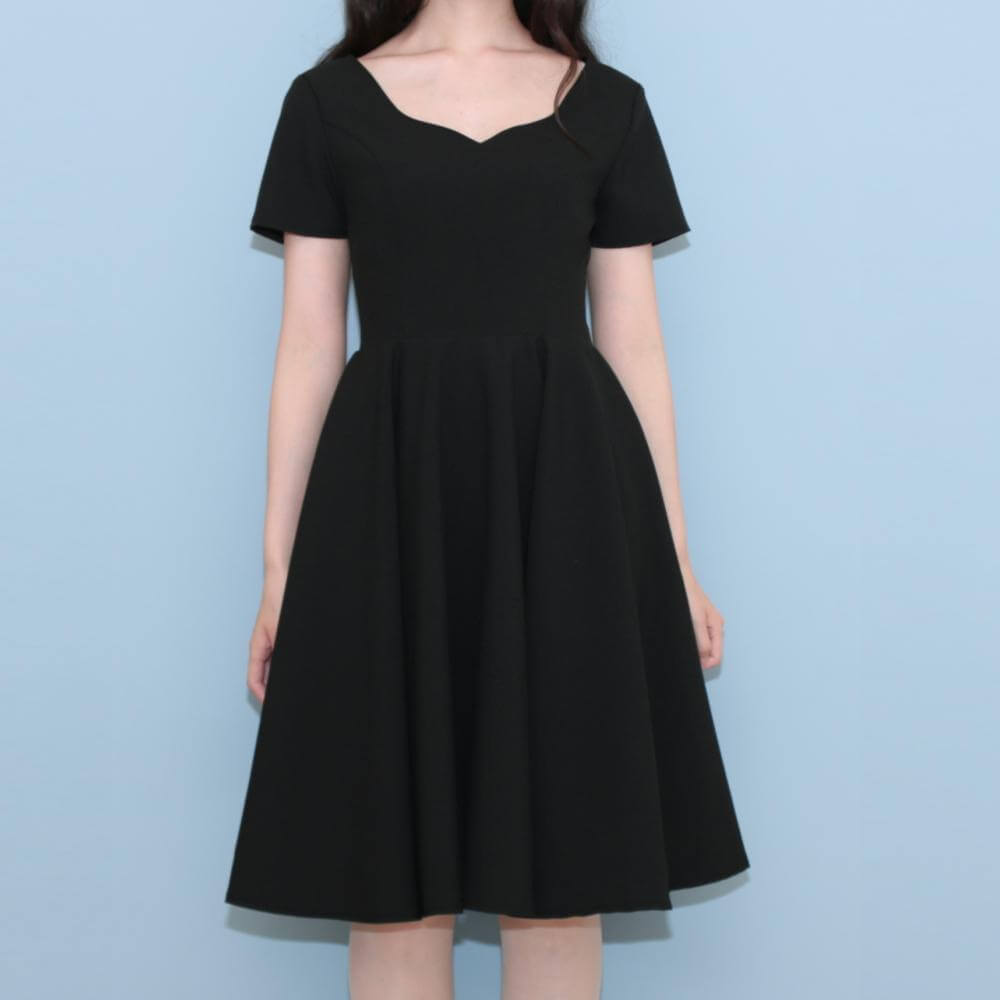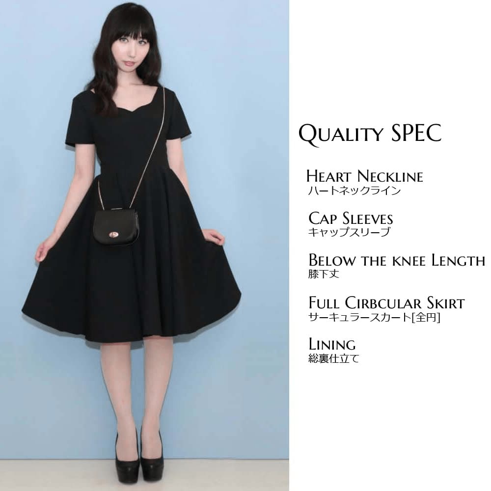 スカートは膝下丈、サーキュラースカートのブラックドレスです。