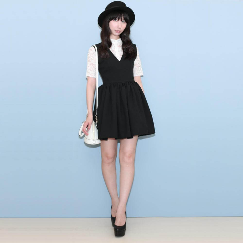 プリーツギャザースカートにミニ丈のブラックドレスです。